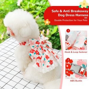 Cute Floral Dog Harness Dress and Leash Set for Small Dog Cats Girl Puppy Bowknot Princess Birthday Dress Summer Female Pet Small Dog Clothes Lace Doggie Kitten Outfits Apparel(Red,XS)